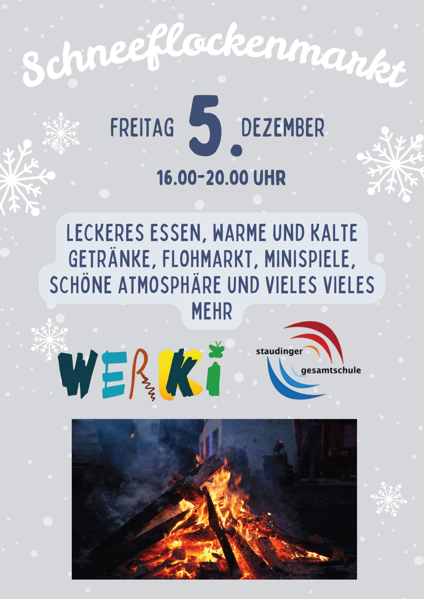 Von 16:00 bis 20:00 Uhr erwartet Euch eine gemütliche, winterliche Atmosphäre mit leckerem Essen, warmen und kalten Getränken, einem Flohmarkt, Popcorn über dem Lagerfeuer und vielen weiteren Aktionen.