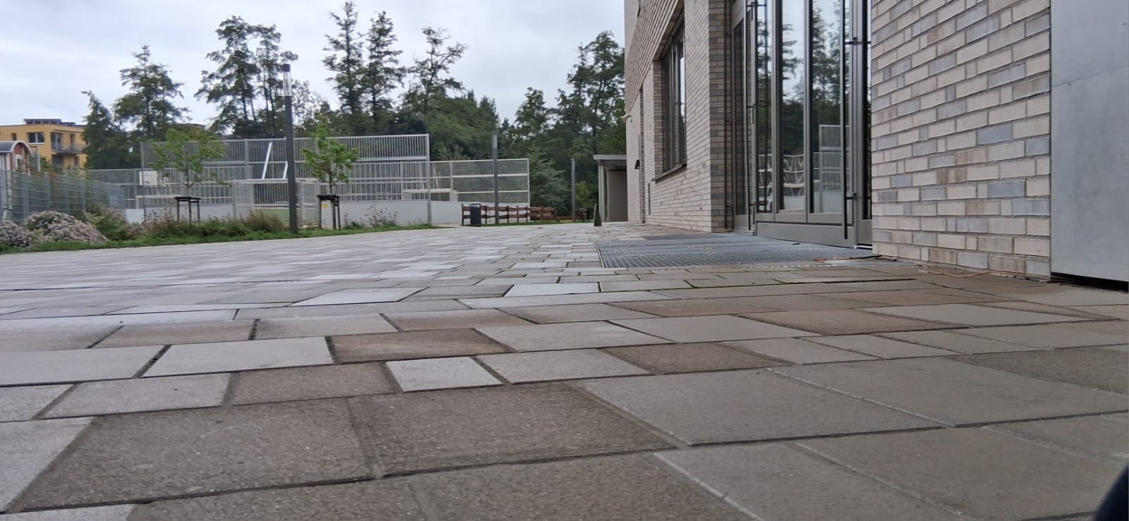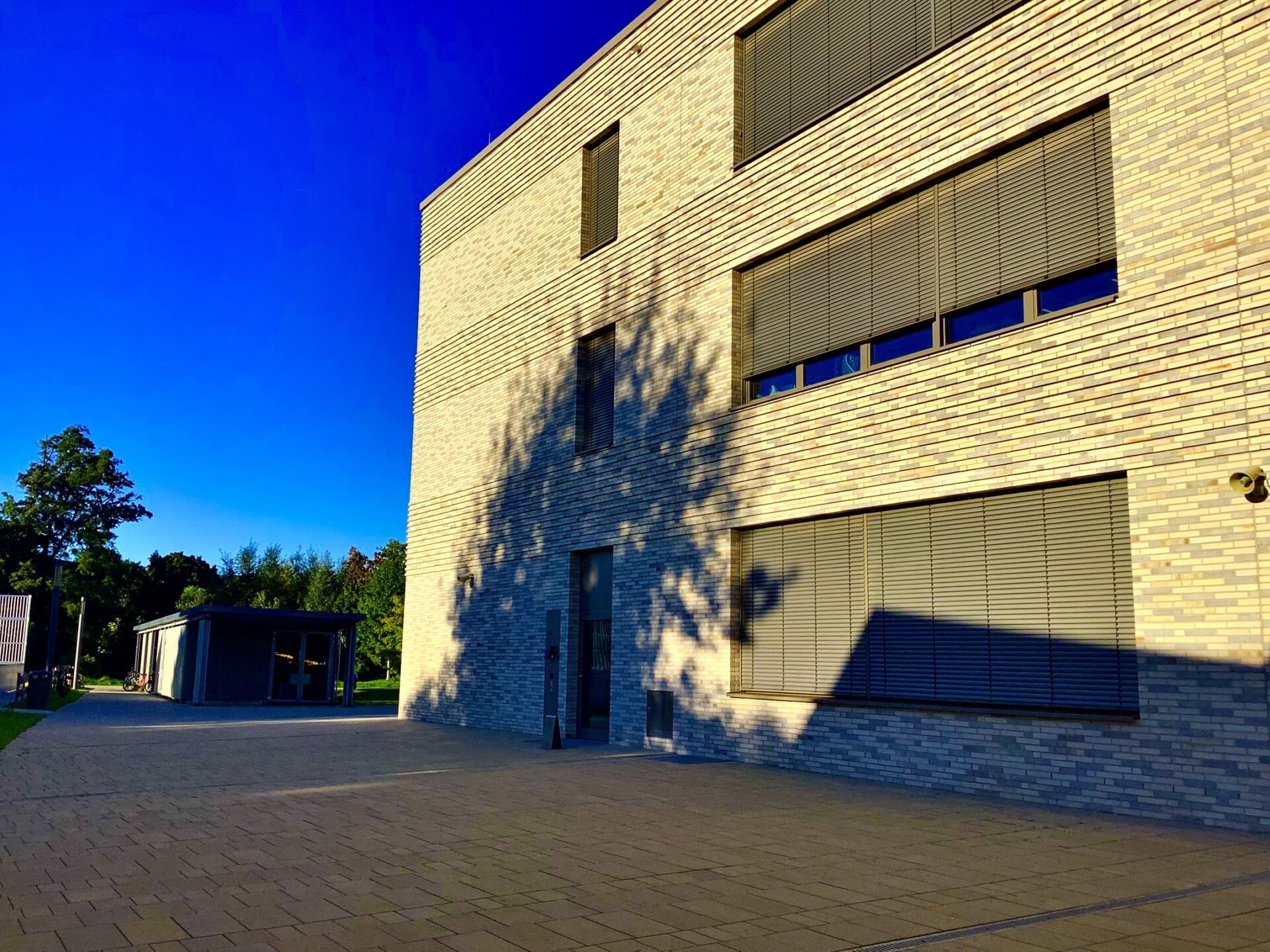 Der Neubau hat zwei Haupt- und zwei Nebeneingänge. Auf der Nordseite (von der Staudingerstraße kommend) liegt der Haupteingang in Haus B, auf der Südseite (Bachseite) in Haus C. Die Nebeneingänge liegen in den Häusern A und D.
