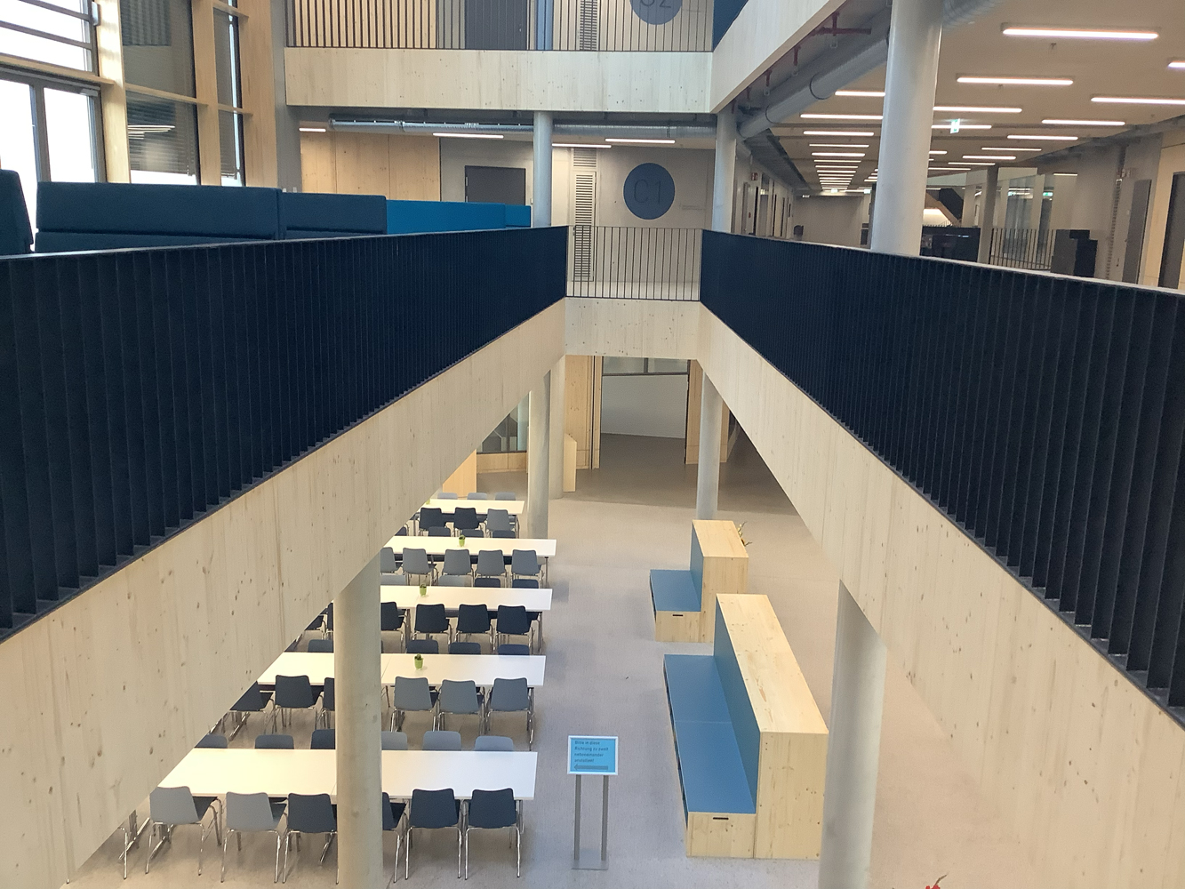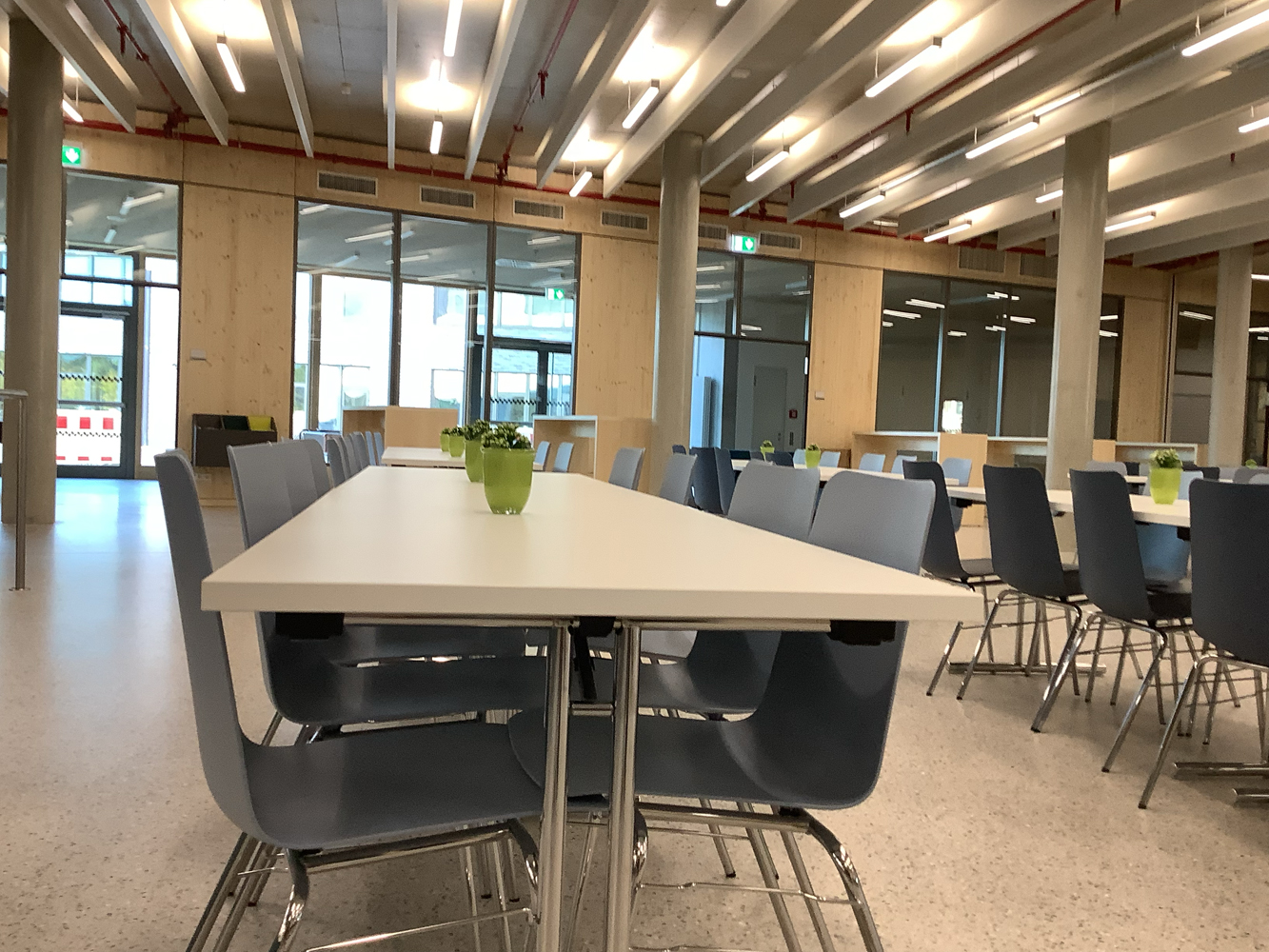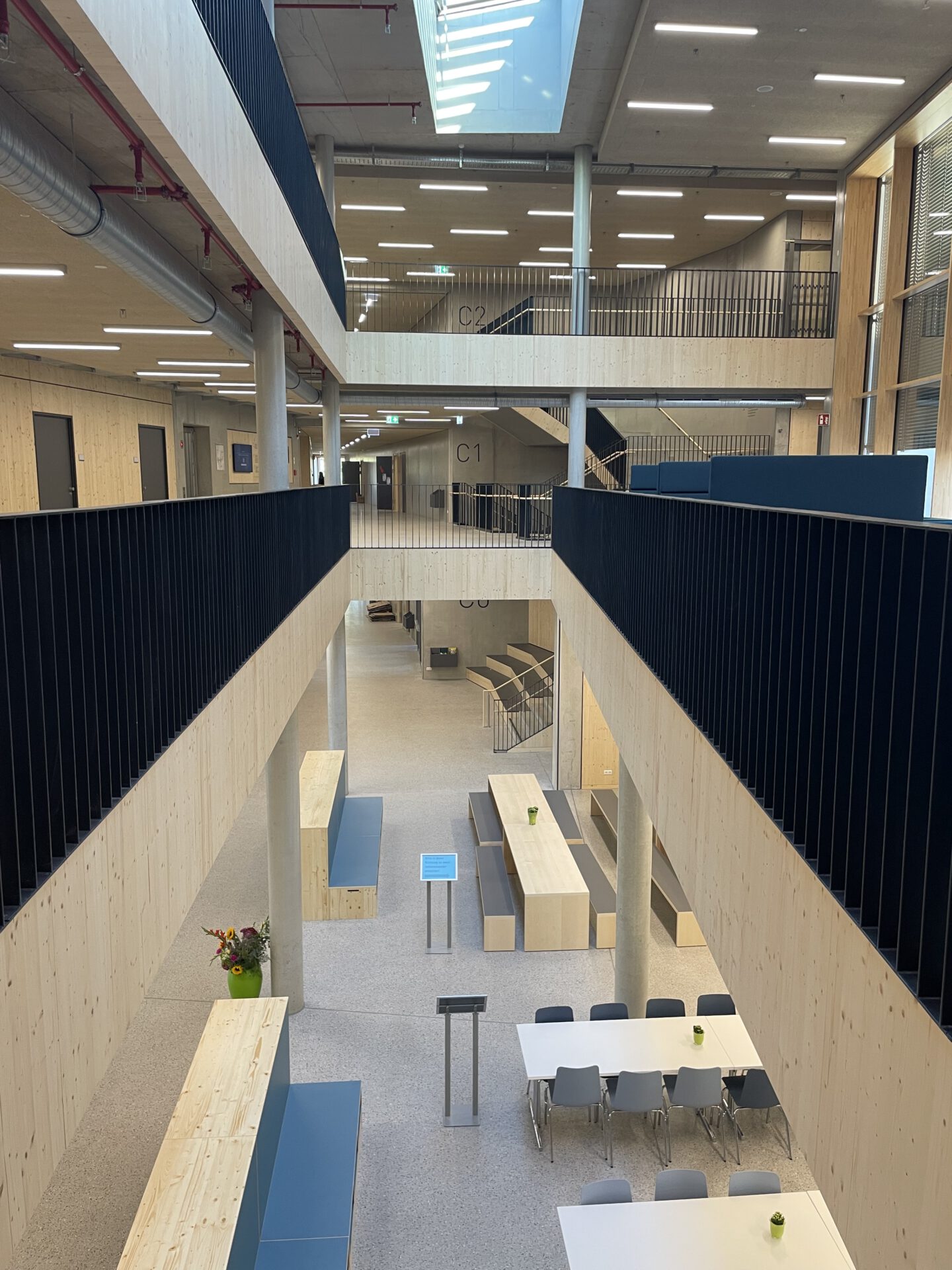 Eine Magistrale ist eine Art Hauptstraße, die verschiedene Bereiche miteinander verbindet, in unserem Fall z.B. die verschiedenen Jahrgangshäuser bzw. Fachbereiche auf einem Stockwerk. Die Magistralen sind aber auch Kommunikations- und Begegnungsräume, die alle nutzen dürfen.